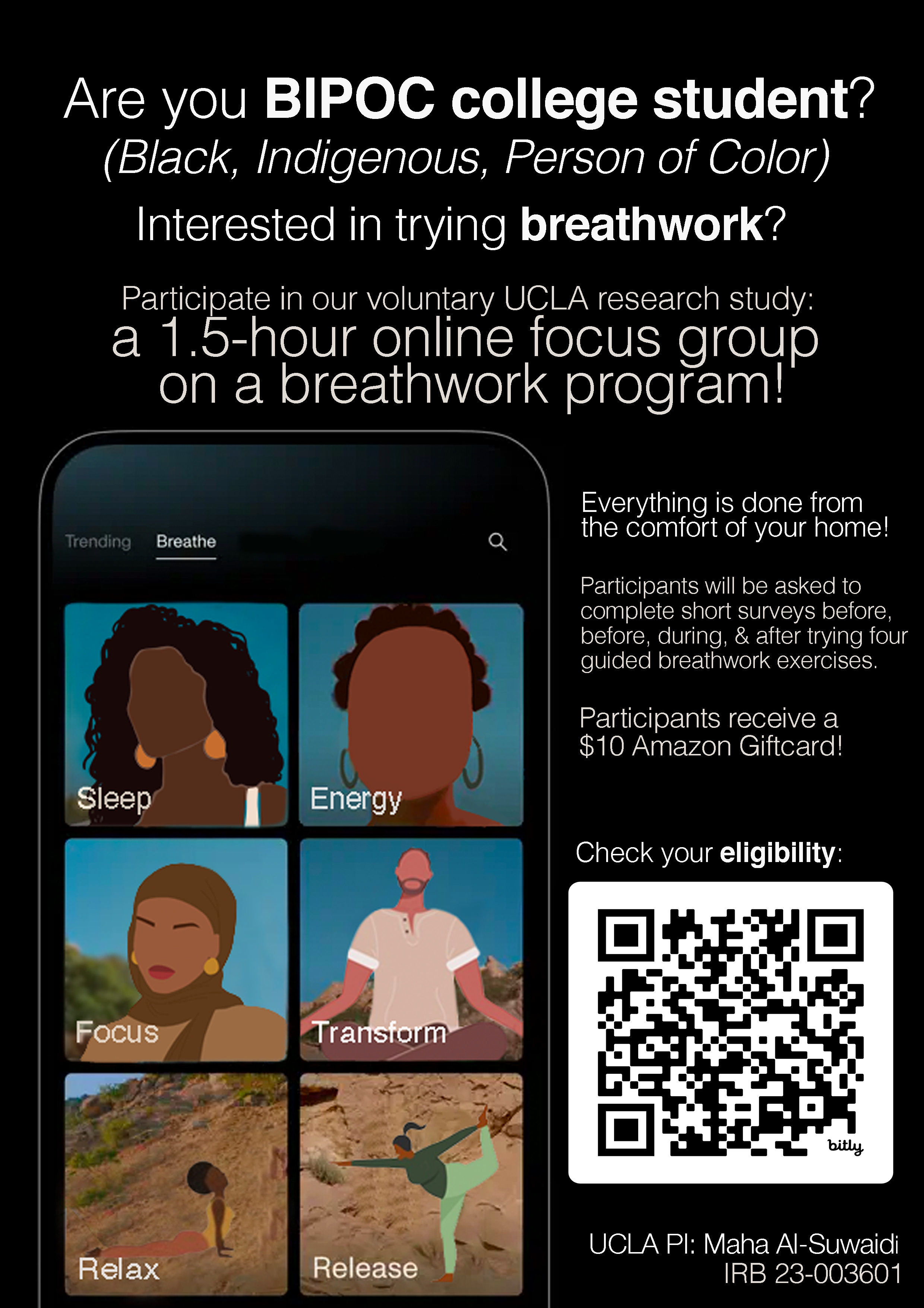 The Breathwork for Healing study aims to understand how brief, app-delivered breathwork exercises can support stress and anxiety management among BIPOC college students (Black, Indigenous, or People of Color). This focus group offers participants a short preview of the upcoming 14-day breathwork pilot program, allowing us to gather early feedback before launching the full study. All activities are completed virtually from the comfort of your home.