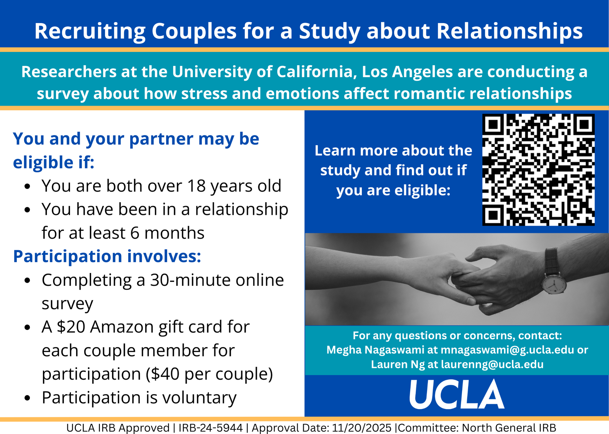 Researchers at the University of California, Los Angeles are conducting a survey about how trauma and stress affect romantic relationships. We hope to better understand how experiences of trauma or stress impact emotions and experiences in romantic relationships. You and your partner may be eligible if you are both over 18 years old and you have been in a relationship for at least 6 months. Please contact uclastressrelationships@gmail.com if you are interested in participating or would like to learn more! Couples who complete the 30-minute online study will receive a $40 Amazon gift card.